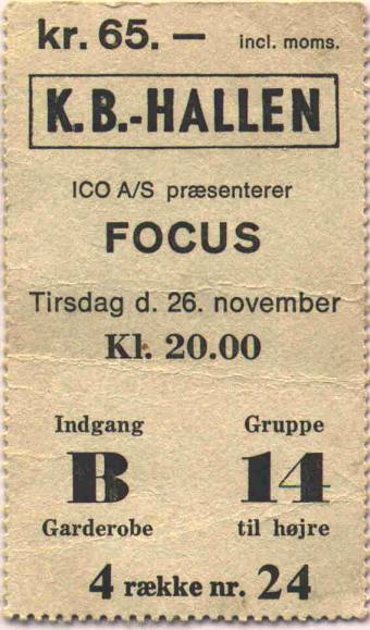 I got this FOCUS' concert ticket from one of my friends who visited a FOCUS concert in Denmark. FOCUS played at 26th of November 1974 in the KB Town Hall, Copenhagen. The price was 65 danish kroner, which was about 7$ at that time. The guy who visited this concert had a seat at the 4th row, chair no. 24. So he had a good view.